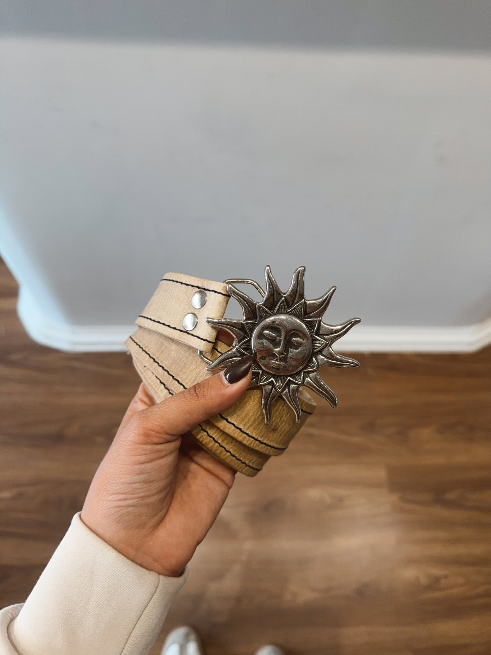 CINTO SOL CON CARA PLATEADO CUERO CRUDO COCIDO