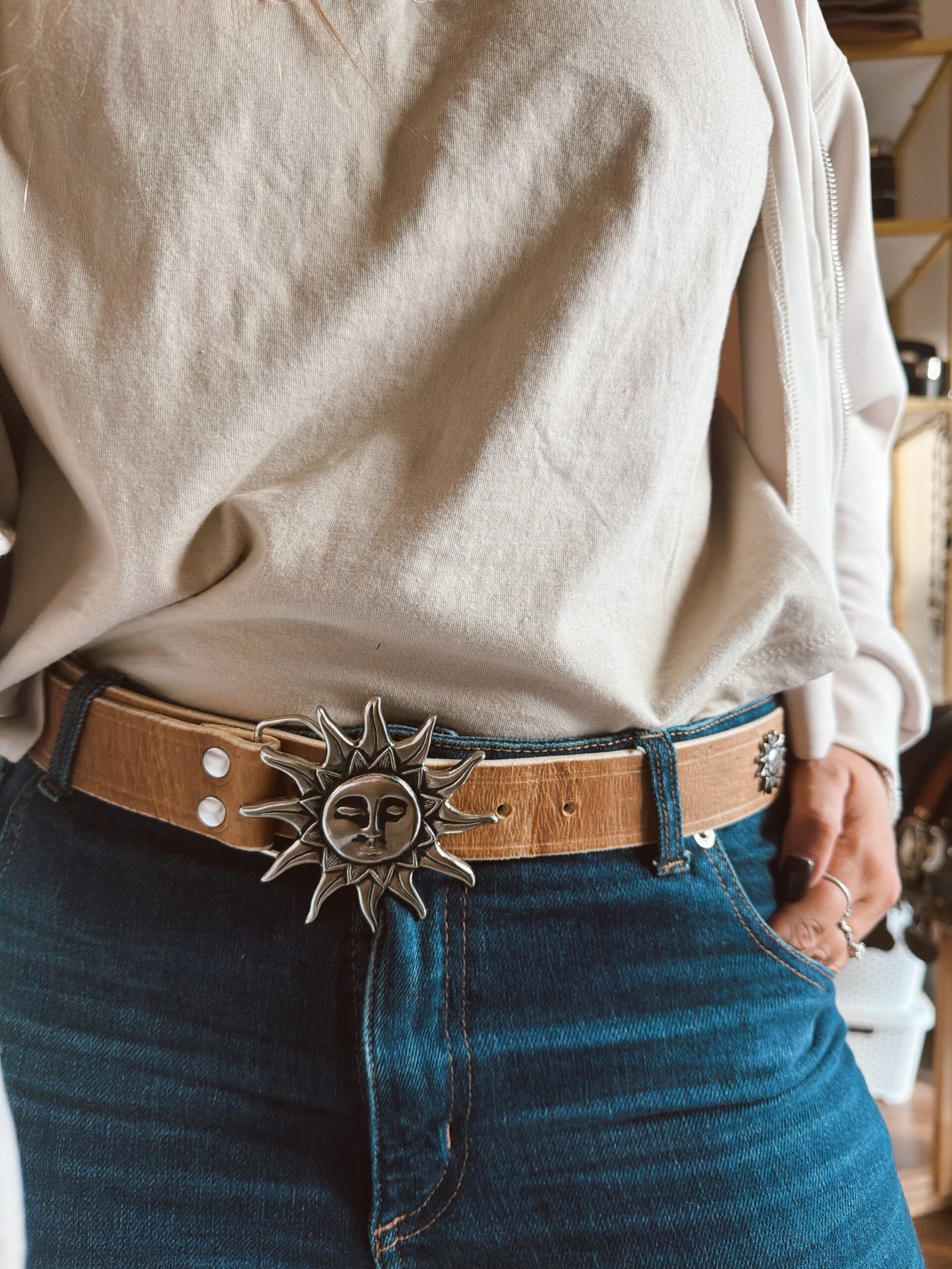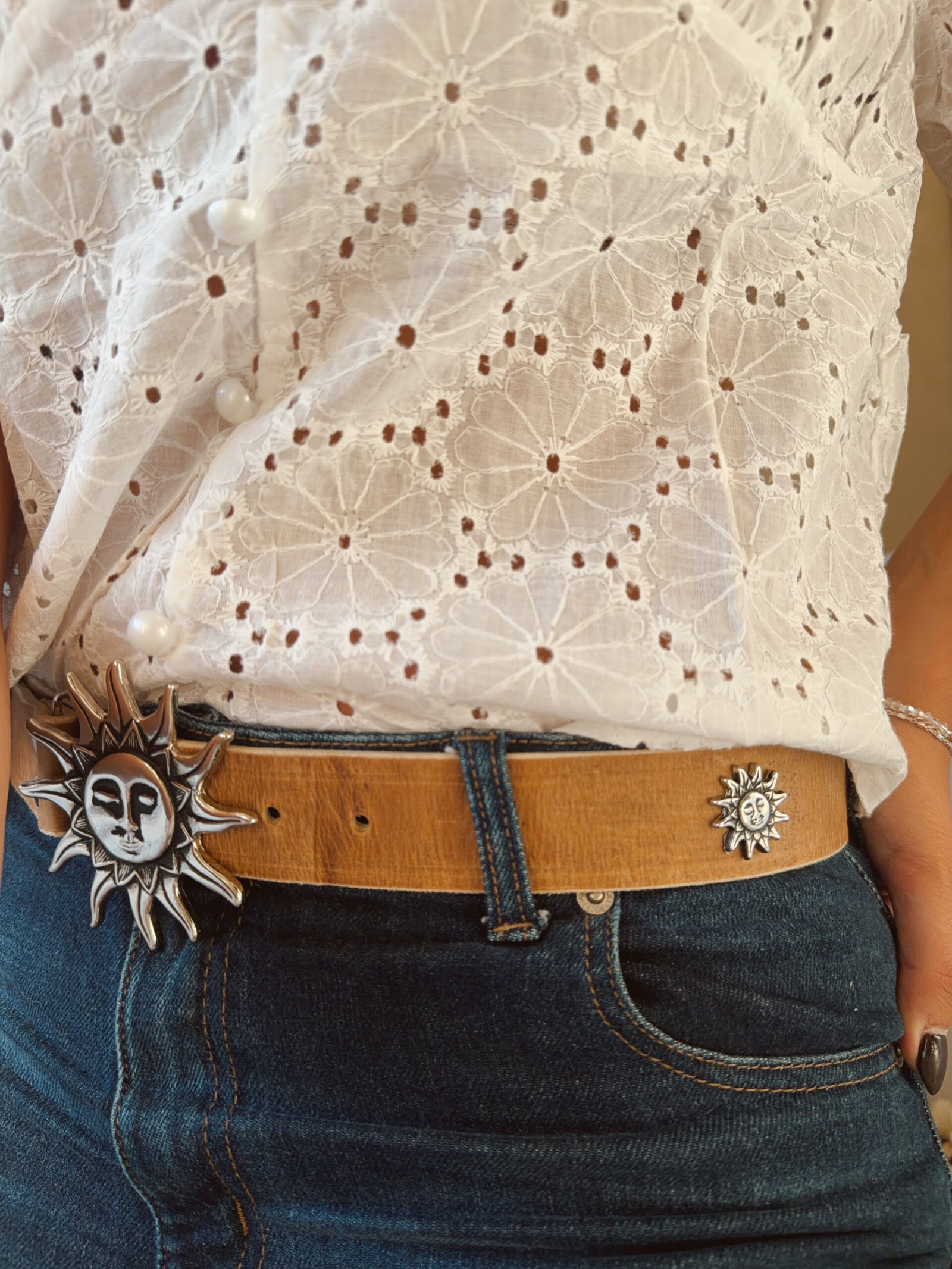 CINTO SOL CON CARA PLATEADO CUERO CRUDO Y APLIQUES