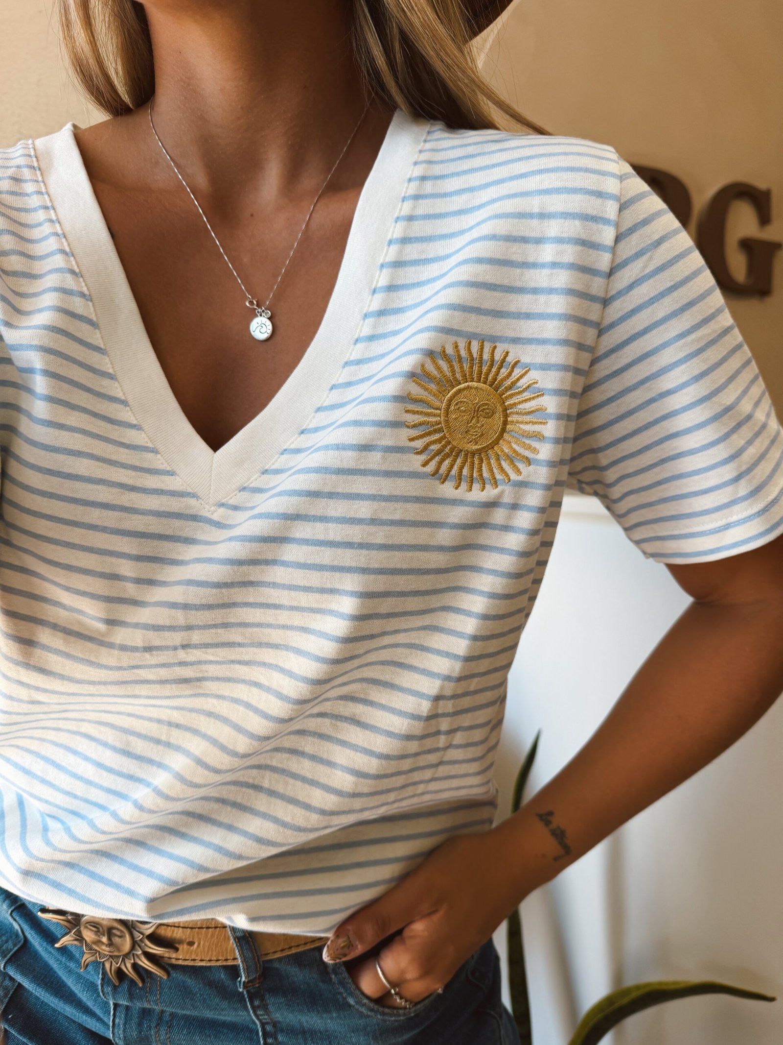 REMERA RAYADA ESCOTE V SOL BORDADO