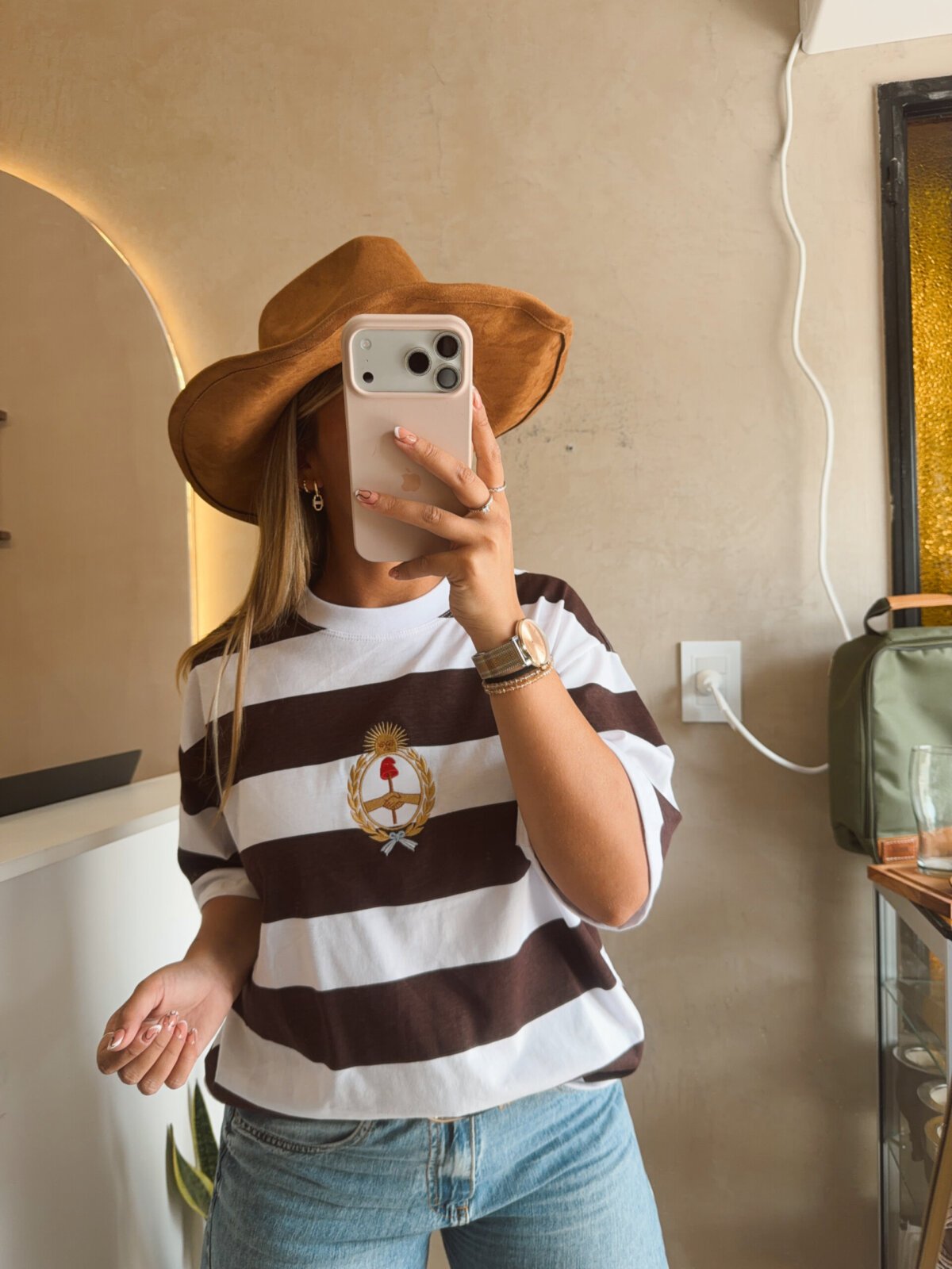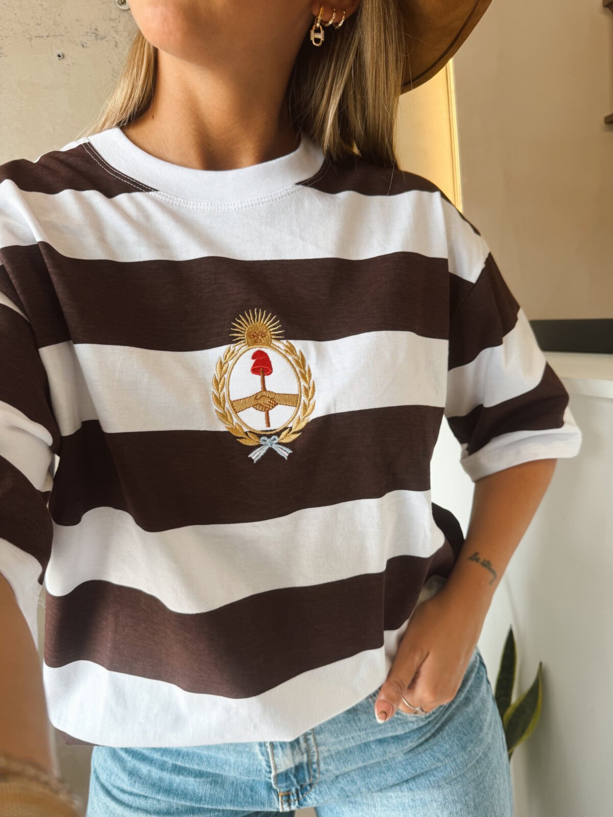 REMERA RAYADA ESCUDO BORDADO MARRÓN